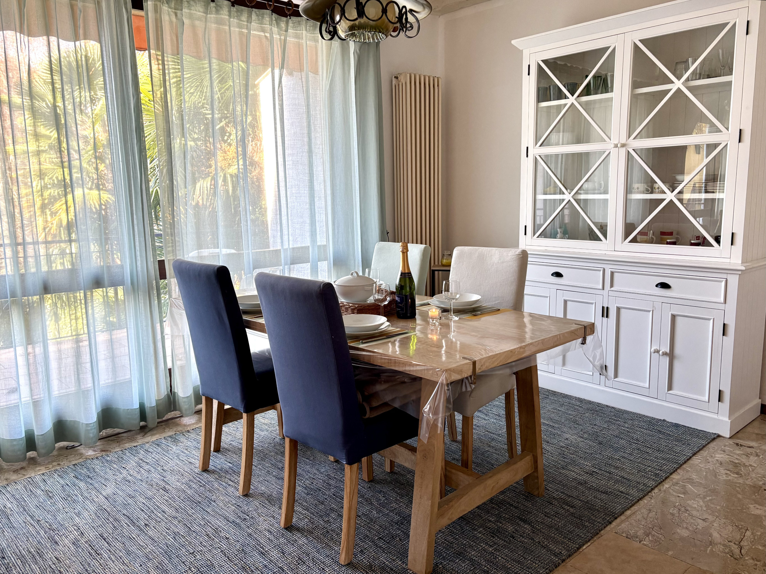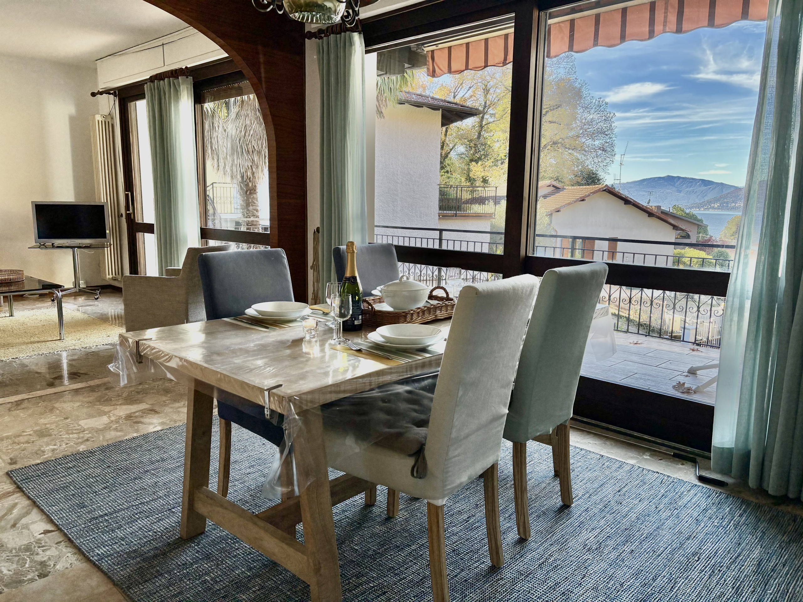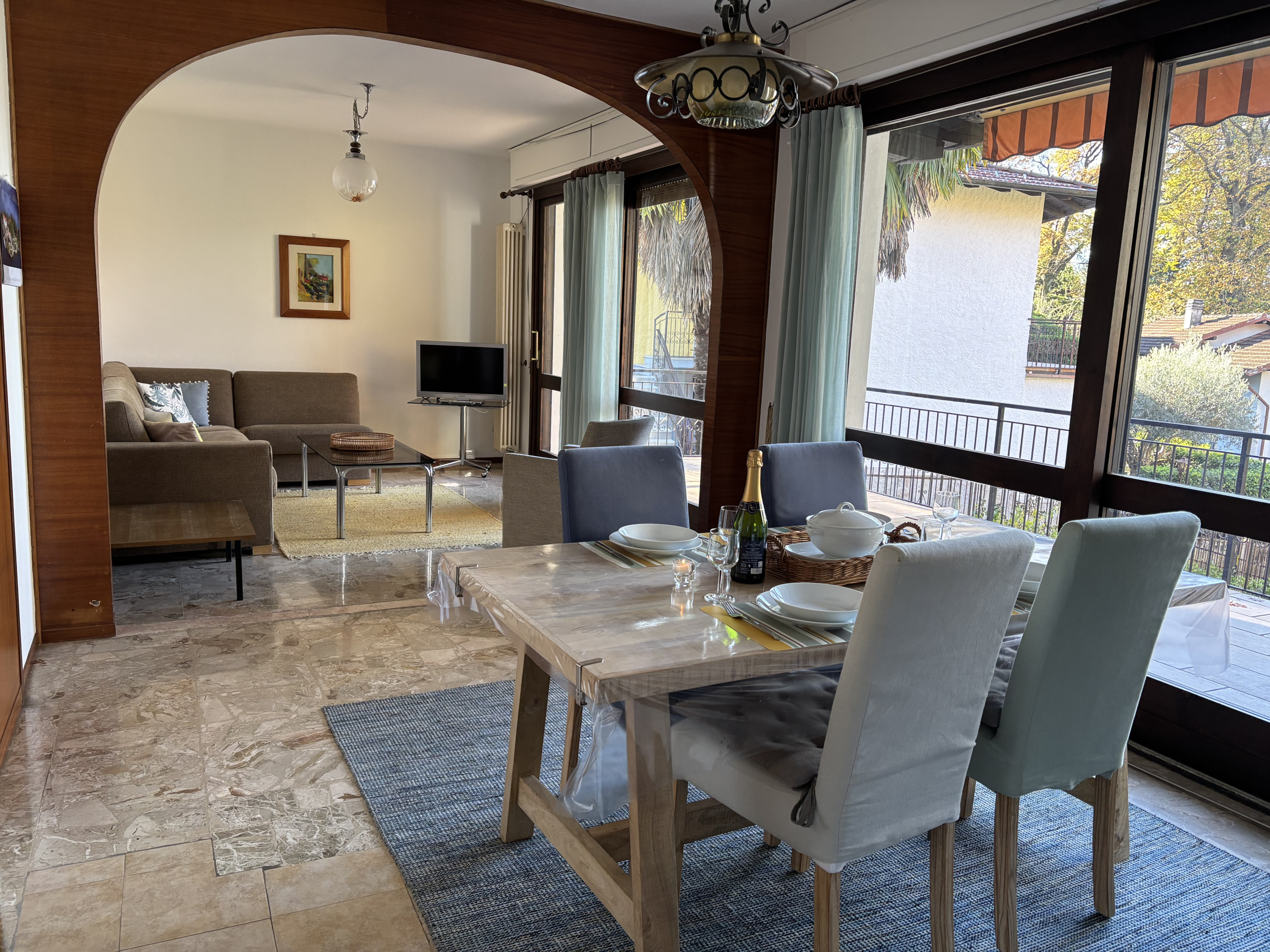 Al piano terra di una casetta a schiera, immersa nel verde di un grande parco con piscina non lontano dal centro di Luino e dal lago, vi è un grazioso appartamento, dalla superficie di circa 80mq, arredato con gusto e in modo accogliente, e munito di un adorabile piccolo giardino privato. L'appartamento è composto da un luminoso soggiorno, munito di una graziosa zona da pranzo con camino, una cucina separata assai funzionale, un ampio bagno e 2 camere da letto, per un totale di 5 posti letto. L'area esterna, oltre che dal grazioso giardinetto sopramenzionato, include anche una terrazza coperta annessa a quest'ultimo, e la zona vede che circonda la piscina, di utilizzo pubblico, già citato. La casa dispone inoltre di TV satellitare, lavastoviglie e un parcheggio privato. Animali ammessi a pagamento.